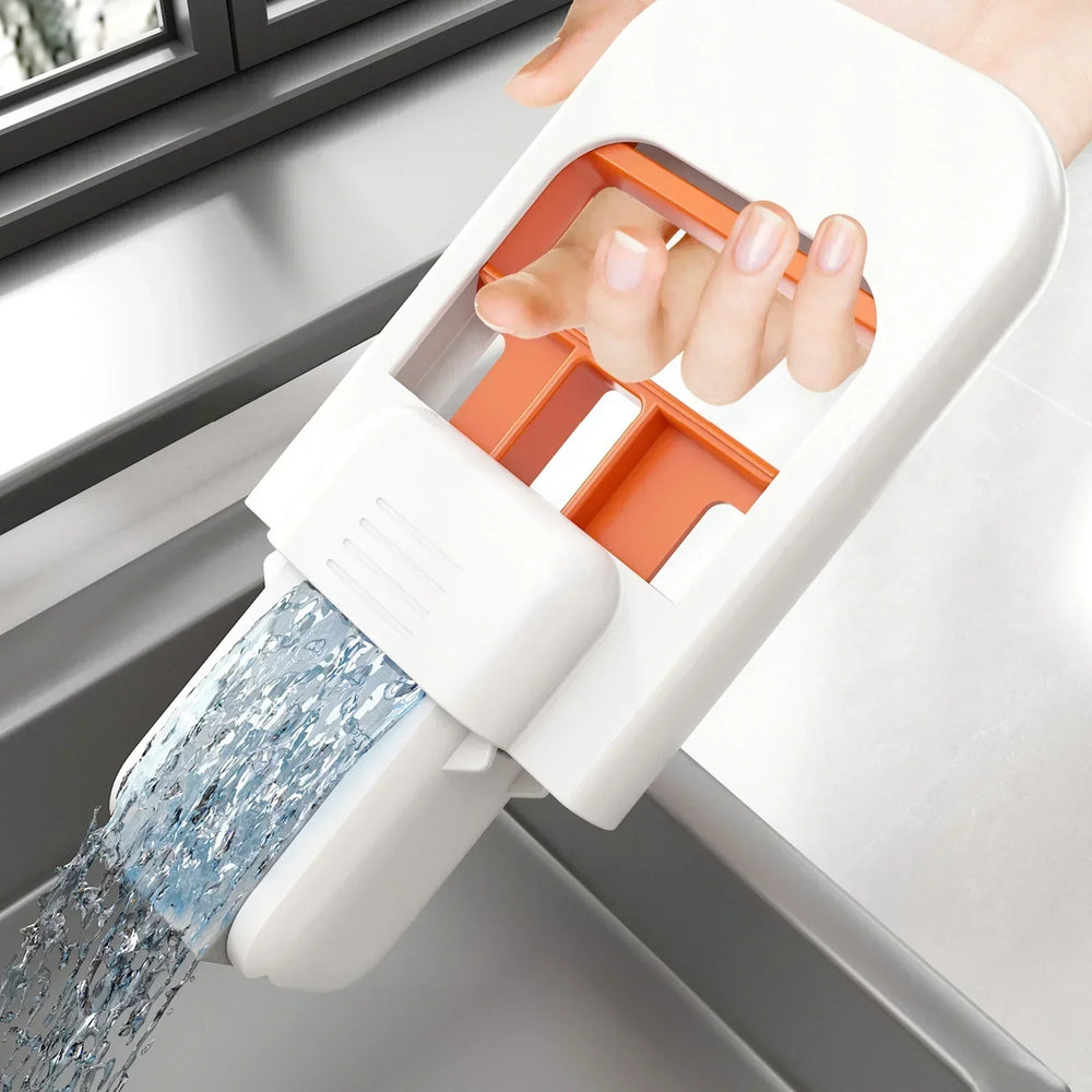 Answer 2: The device features a hands-free squeezing mechanism. By simply pulling the handle or folding the unit, the head compresses to wring out dirty water and excess moisture, keeping your hands clean and dry during the process.